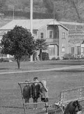 Just behind the flagpole we can make out a young fan palm. Luckily a Papers Past search turned up information which strongly suggests the palm we see here – a Washingtonia robusta or Mexican fan palm – was planted in 1911, as one of 12 palms imported from Australia and planted in probably three locations in Whanganui. Other palms were planted in Pākaitore after 1911, but this was probably the first.