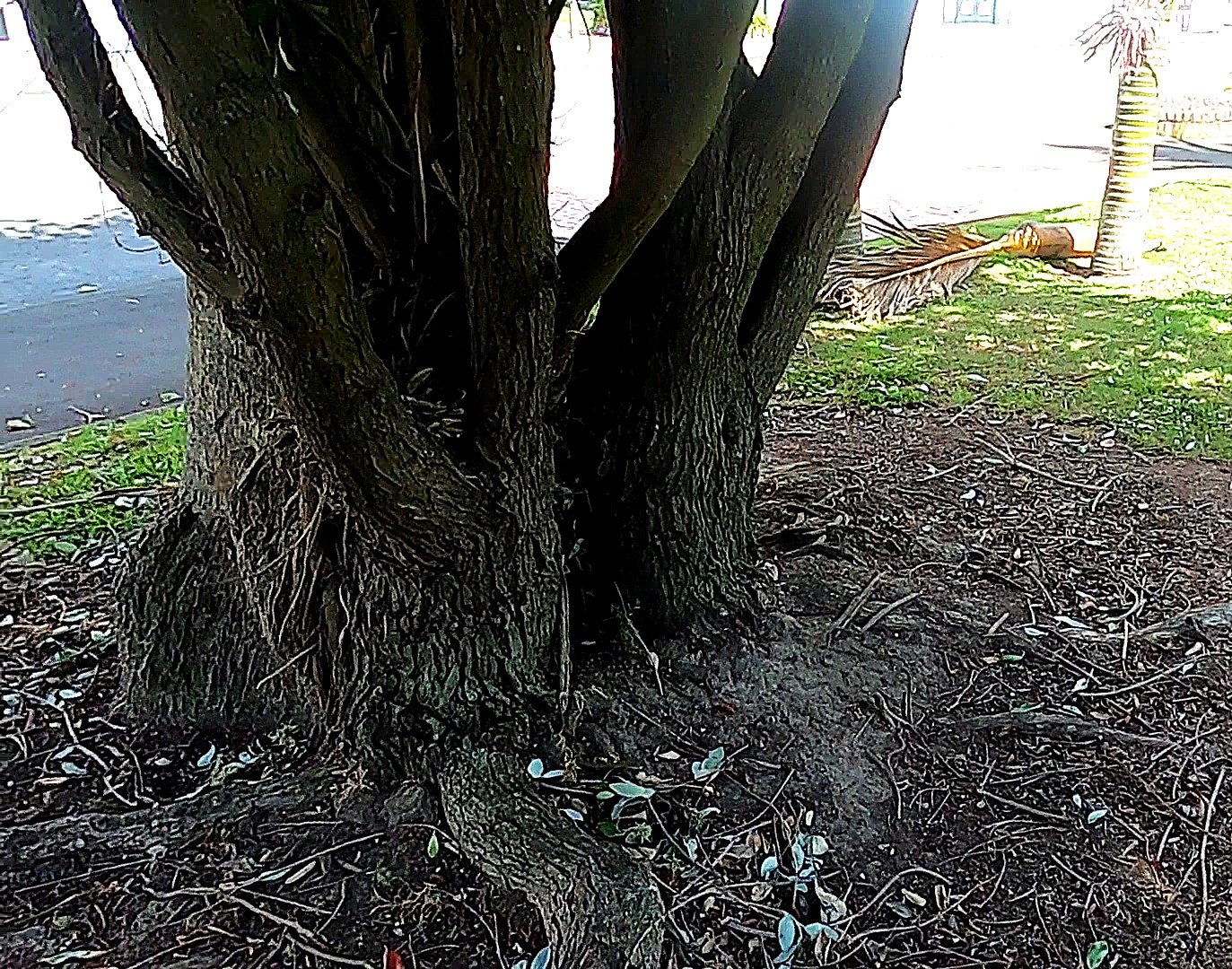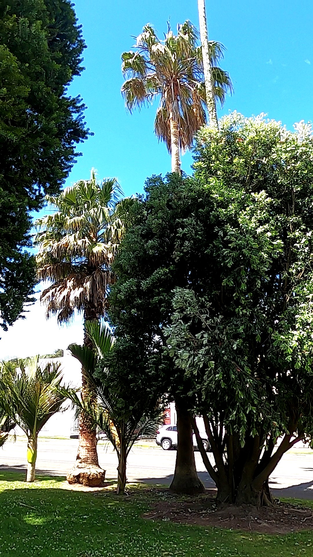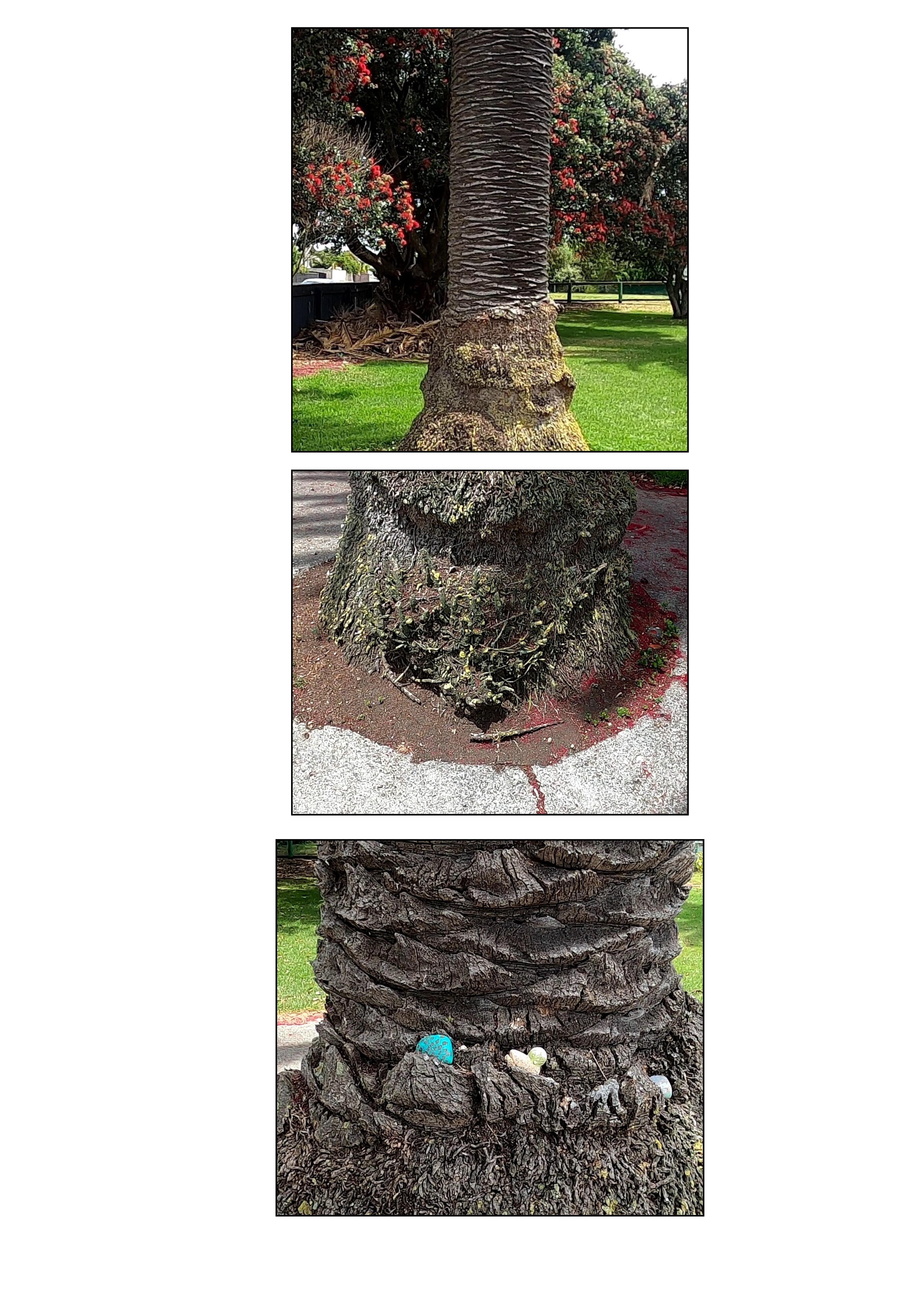 The top photo shows a large Phoenix palm growing very close to a number of pohutukawa that are flowering. The seeds that will shortly result from this flowering are very small and light. They will easily reach the fibrous parts of the Phoenix trunk, within which they will readily germinate. This has indeed happened from a previous flowering, as seen in the middle photo. However, we can clearly see that the juvenile pohutukawa have been cut back, presumably by the garden staff who tend this small garden. I have not talked to any staff here, but in the final photo we can infer a reason for the prompt removal of any (and there will be many) germinating pohutukawa. We can see three ‘painted pet rocks’ that are lodged in a part of the skirt of the Phoenix, thus holding the pet rocks relatively securely. Alma Gardens is a facility for people with intellectual disabilities, so perhaps the rocks were placed there by people attending the centre. This could indicate an emotional attachment to the Phoenix palms (there are 4 here) as a significant tree itself, and also because of their convenient ability to safely hold the pet rocks. I’ve never seen pet rocks placed in a Phoenix palm like this, so the sight is a very specific glimpse from the local arboretum, perhaps difficult to find again.
