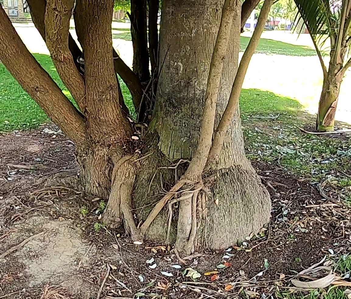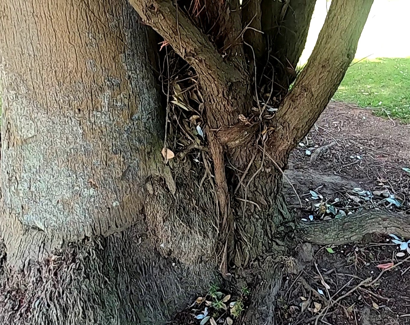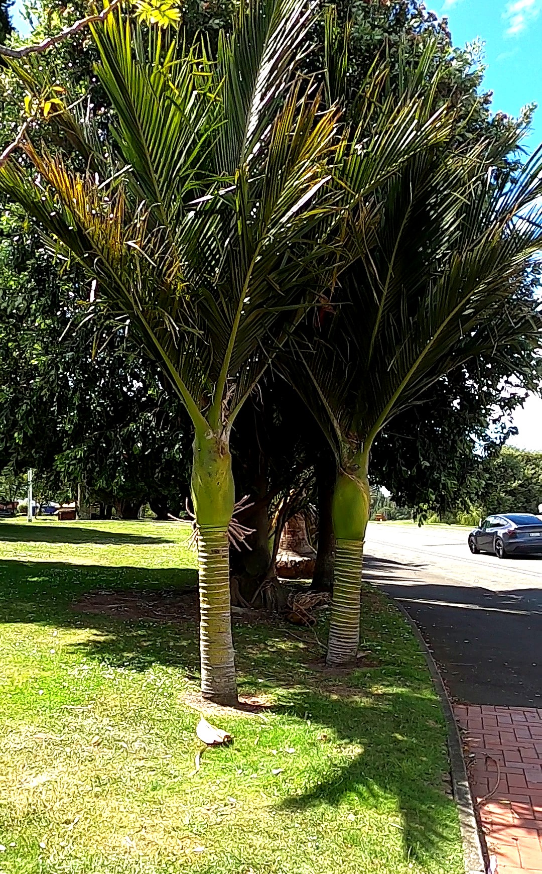 The top photo shows a large Phoenix palm growing very close to a number of pohutukawa that are flowering. The seeds that will shortly result from this flowering are very small and light. They will easily reach the fibrous parts of the Phoenix trunk, within which they will readily germinate. This has indeed happened from a previous flowering, as seen in the middle photo. However, we can clearly see that the juvenile pohutukawa have been cut back, presumably by the garden staff who tend this small garden. I have not talked to any staff here, but in the final photo we can infer a reason for the prompt removal of any (and there will be many) germinating pohutukawa. We can see three ‘painted pet rocks’ that are lodged in a part of the skirt of the Phoenix, thus holding the pet rocks relatively securely. Alma Gardens is a facility for people with intellectual disabilities, so perhaps the rocks were placed there by people attending the centre. This could indicate an emotional attachment to the Phoenix palms (there are 4 here) as a significant tree itself, and also because of their convenient ability to safely hold the pet rocks. I’ve never seen pet rocks placed in a Phoenix palm like this, so the sight is a very specific glimpse from the local arboretum, perhaps difficult to find again.