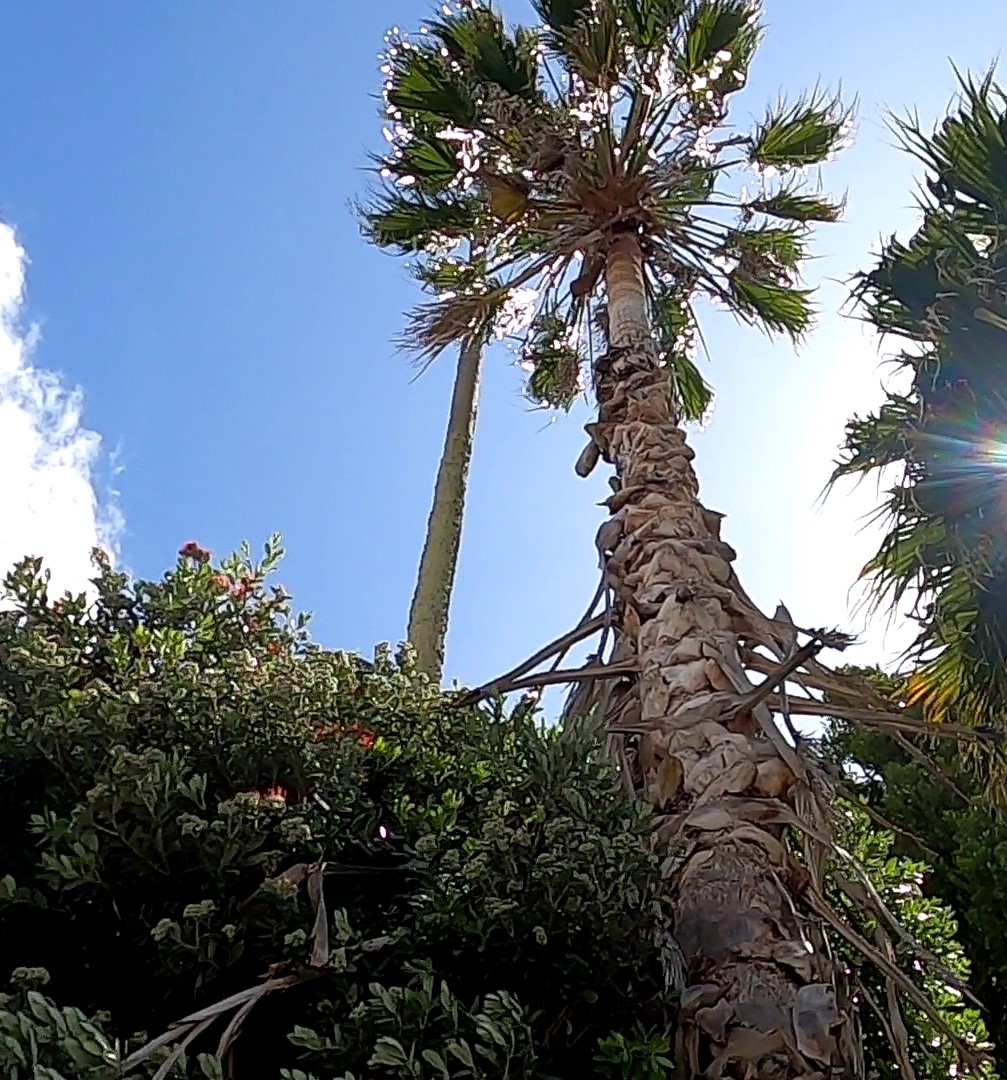 Clearly it is encircled by seedling pohutukawa which have grown very successfully, probably beginning in the fibrous part of the palm’s base. Whereas this is not as large nor as fibrous as that of the Phoenix palm, it is clearly a seed-catching and growing area. Interestingly, none of the nikaus, some of which can be seen in the above photos, have seedling pohutukawa encircling them. This is not because they have been weeded out, but simply because the trunk base of the nikau palm has a different morphology, not having the fibrous base of the two palm relatives we have been focusing on here (there is also a very stout Chilean wine palm near this site, and this also has no seedlings around its base). It would not be surprising to find research by botanists focusing on this difference, but that is not the concern here. A couple more photos are useful here before finishing off: