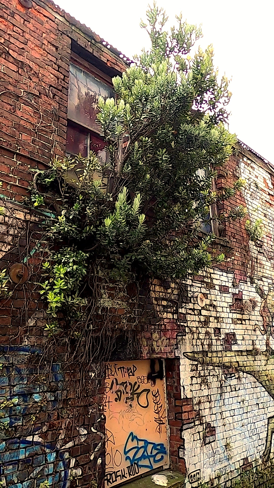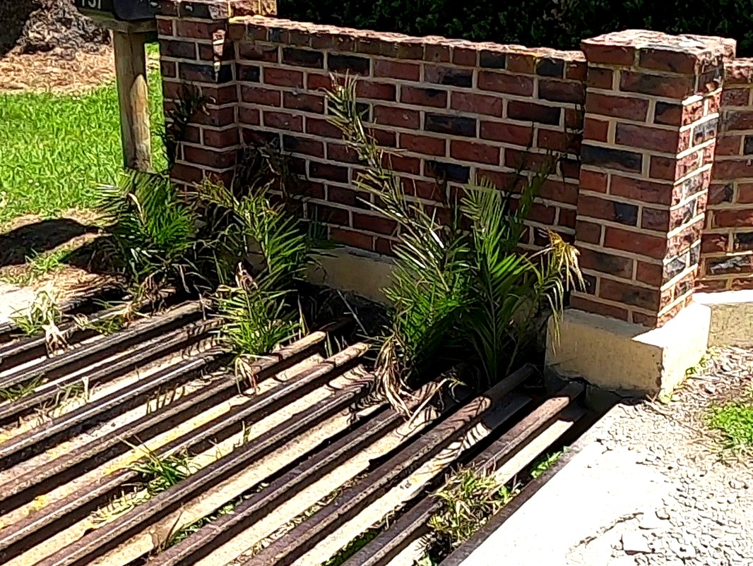 This is in the CBD in Wellington, where a graffiti-covered and almost derelict brick building seems to be sprouting pohutukawa. Just how they manage to grow so healthily, given they are literally growing in mortar, is something of a mystery. And here is an interesting shot of seedling Phoenix palms from a double avenue entrance to a farmhouse in Kai Iwi near Whanganui: