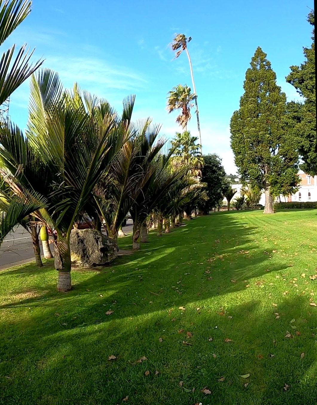 Concern over such an encircling clearly troubles any neat distinction between a preference for native over imported exotic plants. If that distinction is opened up, it should be noted that of the plants on view above, only the nikau palm naturally grew in the Whanganui area before Europeans started planting the then Moutoa Gardens. Interestingly, a search of the local council’s list of notable trees turns up two trees on view here: the kauri and the oldest Washingtonia. Two older pohutukawa, presumably the source of the seedlings encircling the Washingtonia, are also on the list. It is possible that in a few more decades the whole grove of nikau will be included – they will be a stunning site – but perhaps not the encircling pohutukawa. By then more time may be spent reflecting on how to quietly get rid of it, rather than have it registered as notable.