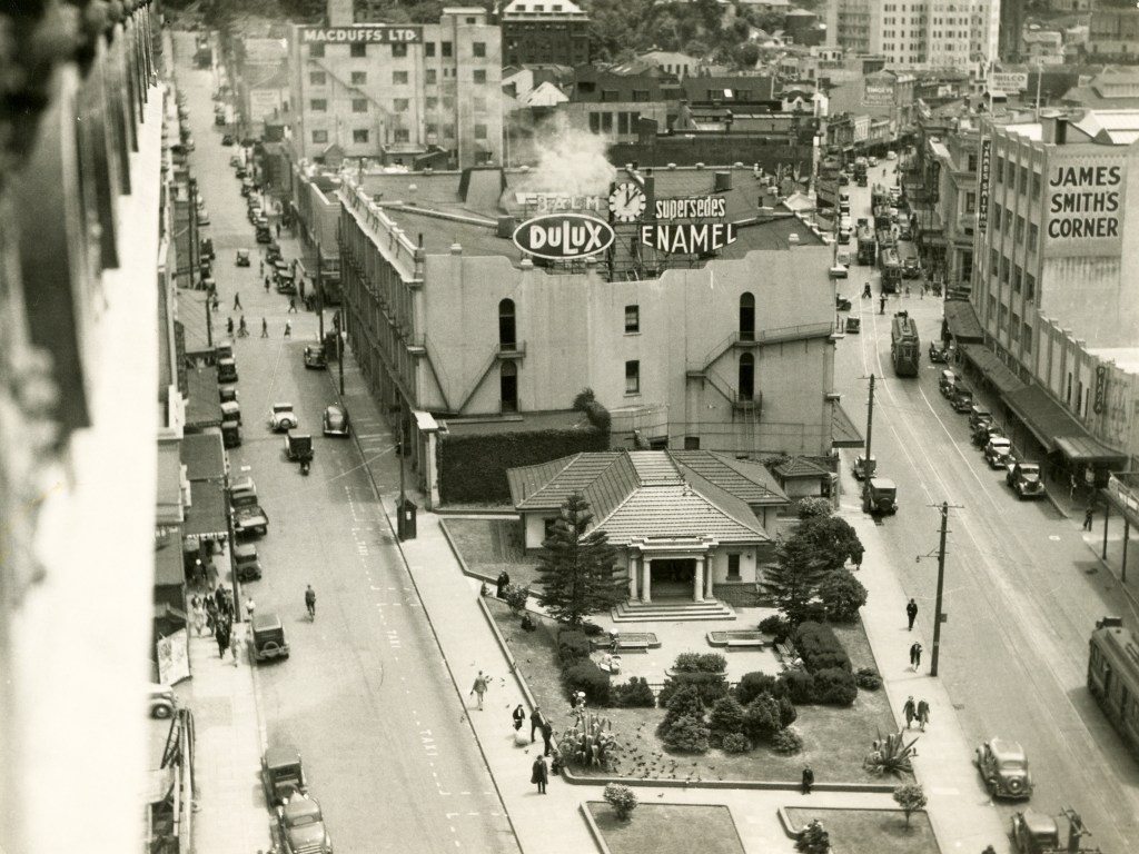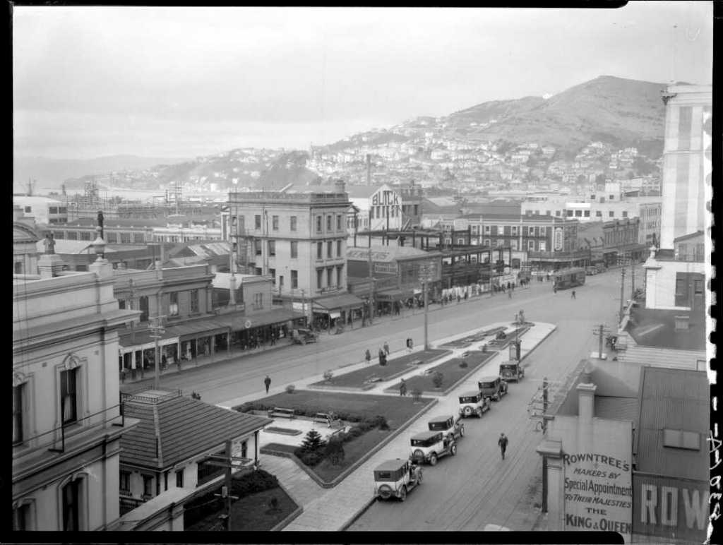 But to be honest it wouldn’t take much more walking around central Wellington to find many other pohutukawa like this (maybe apart from the shoes). Obviously I was interested enough to take some photos, but it wasn’t until I got home that something I often do with candidate noticeable trees proved fruitful. This is the very simple task of searching on DigitalNZ to see if there are any historic photos that might be interesting. This was indeed the case, and luckily these photos can be reproduced here without any copyright issues. The first is dated circa 1940:
