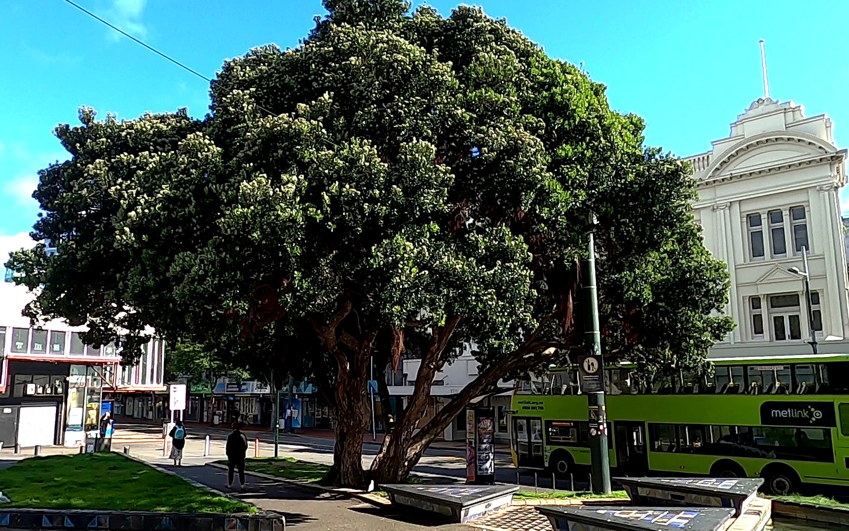 This large pohutukawa is found in Te Aro Park (often called Pigeon Park), just before what used to be known as Wellington central’s ‘party’ street, Courtenay Place. The passing bus gives a good indication of the size of the tree. Some other photos establish that it has the multi-trunk and aerial roots that often make the tree noticeable, giving it in a sense ‘crowd-pleasing’ features: