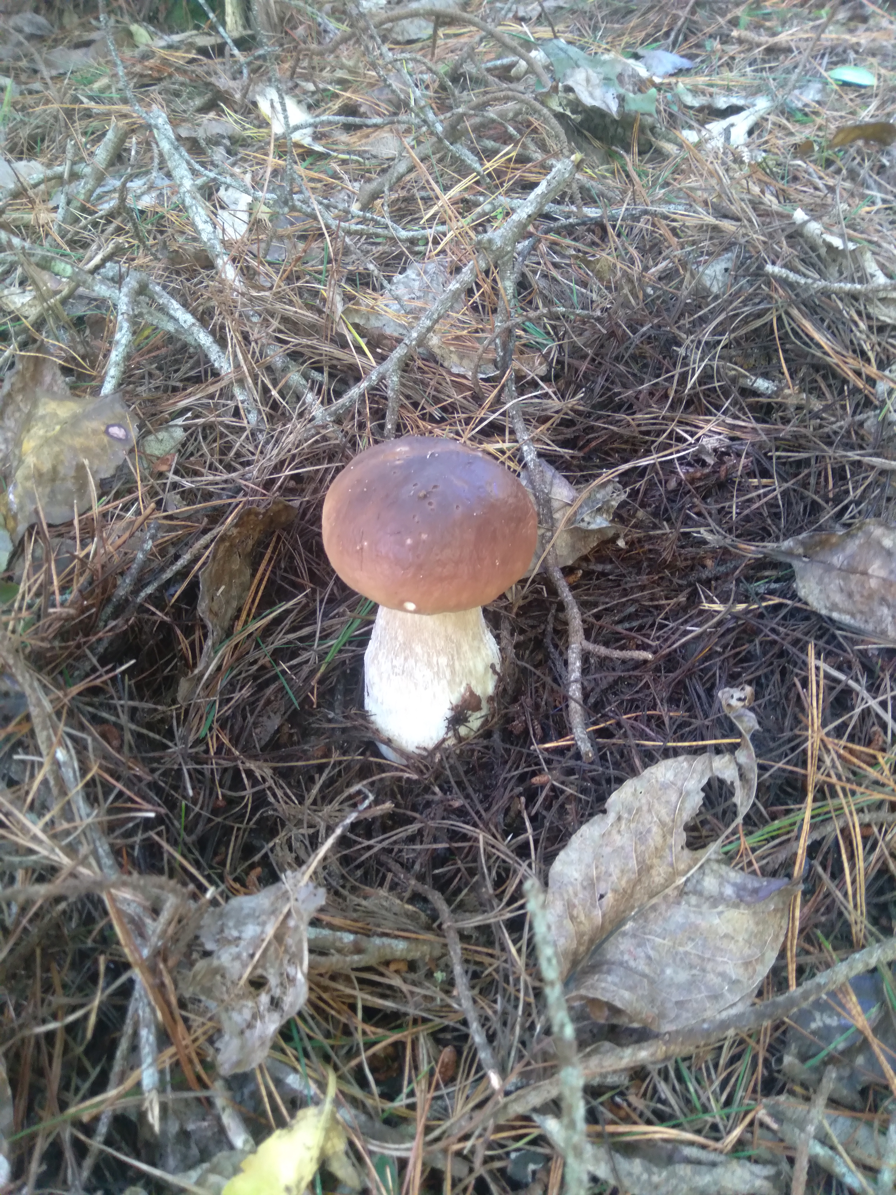 I live close to part of Wellington’s town belt called Polhill/Aro Valley where the walking and biking tracks go through many sizable old pine trees, so that is where I first started looking. After a few weeks of frustration with no success, I had my first find in a spot called ‘Lone Pine’ (this was actually signposted as such). Here’s a photo I took to show off my first harvest, a fine-looking porcino amongst the pine needles: