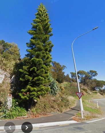 Brad Cadwallader of the New Zealand Tree Register has visited the tree and assures me the tree is still present (Google ghosts do occur). The camera lens of Google Street view has a fishbowl effect making the streetlight appear at an angle, but there is little doubt the tree itself has the typical distinct lean to the north.
