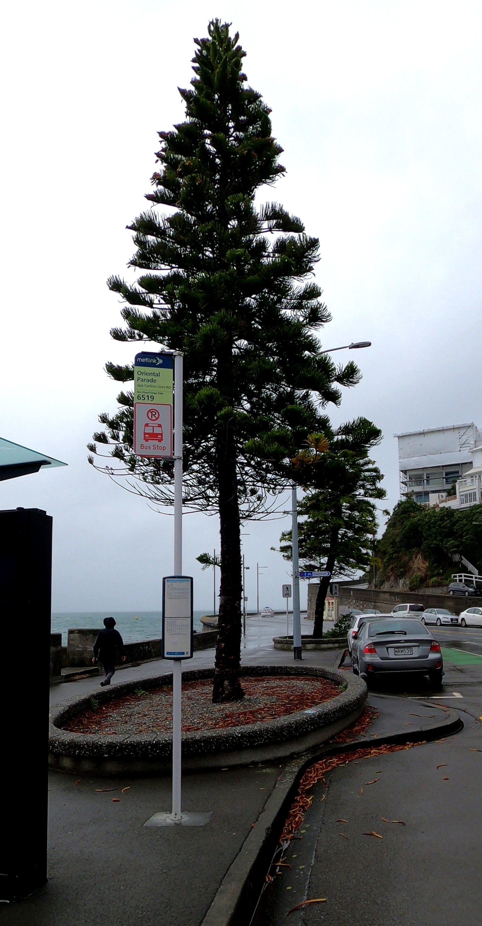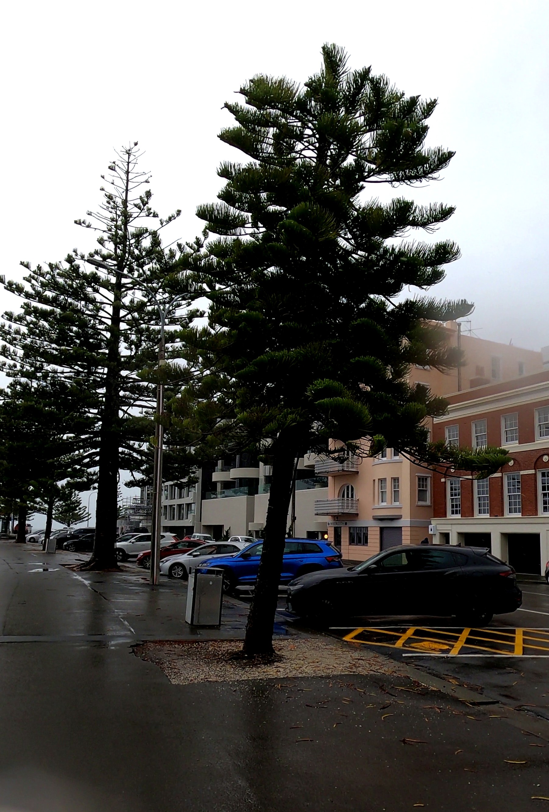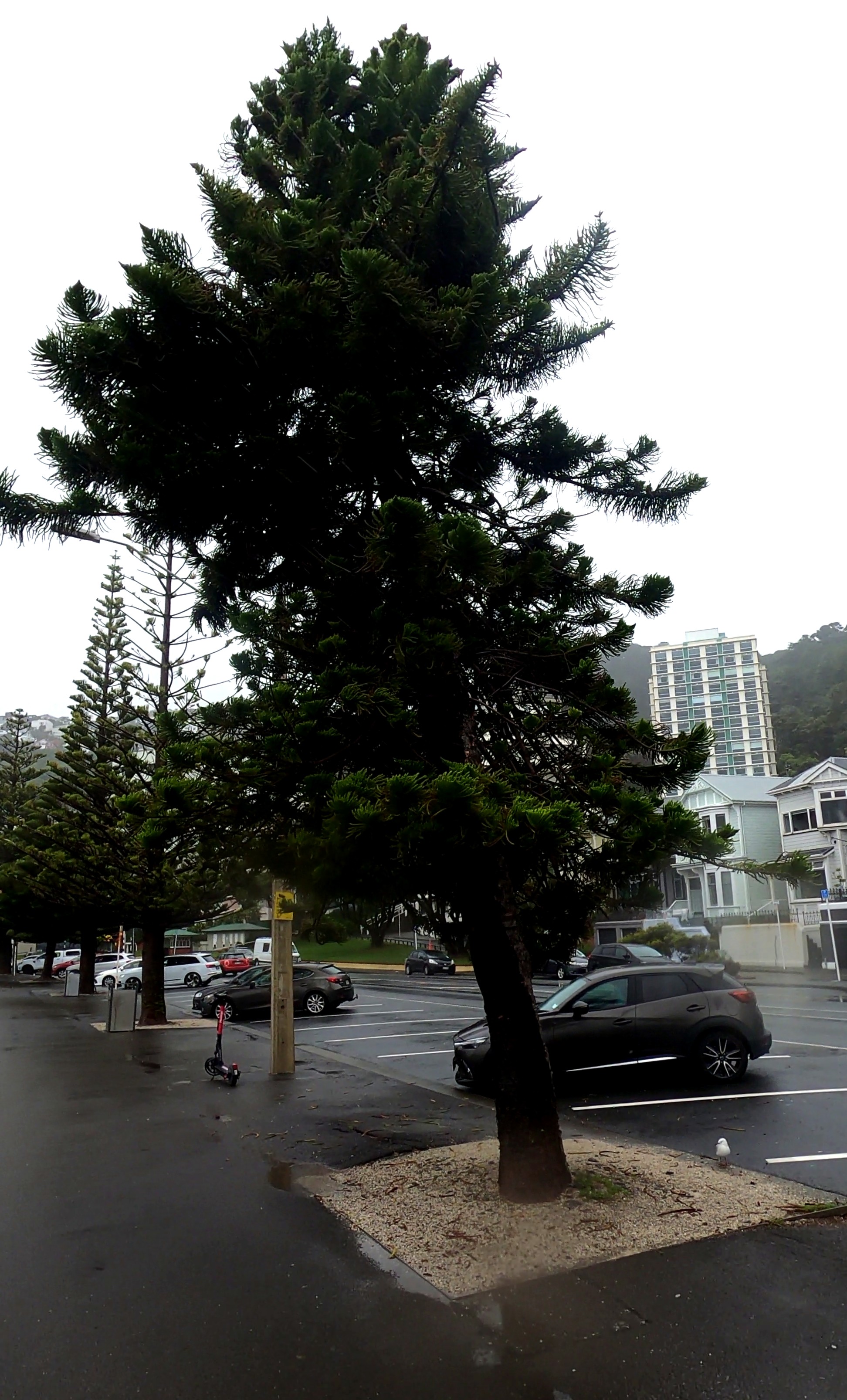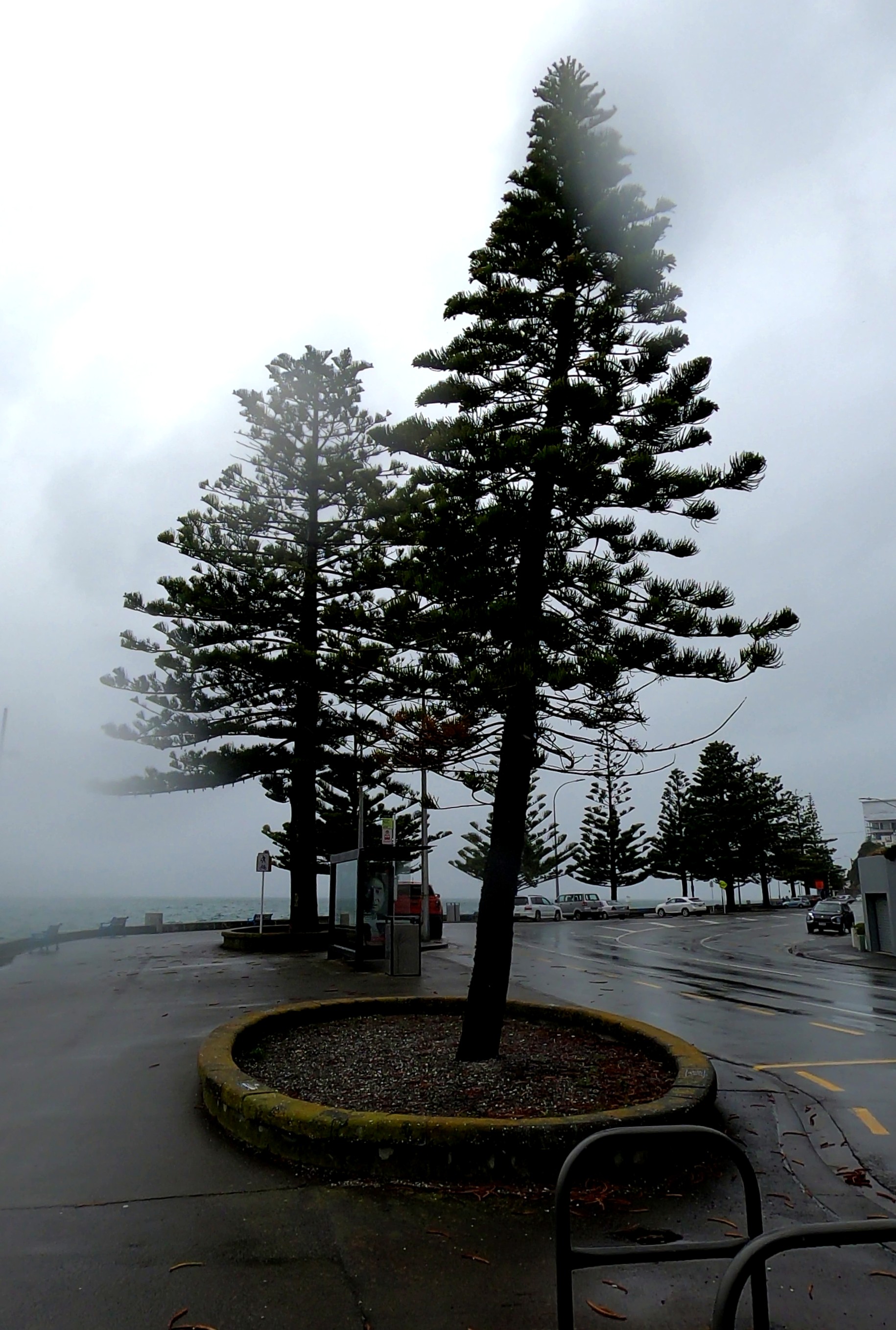 If we take the Whanganui example above as number 1 in my sample, we can note that it does lean to the north, but it also shows what I’ve called a ‘corkscrew form’. Next, I discovered five A. columnaris on Wellington’s Oriental Bay. These are planted amongst an iconic seaside cluster of Norfolk Island pines, the oldest of which were planted in 1921, with the Cook pines planted at a later date. Given the small number, we can look at all of them and note the direction of their lean. I’ll number them as I go, and proceed from south to north along Oriental Parade, covering a distance of about 600 metres (NB: it was a rainy day when the photos were taken):
