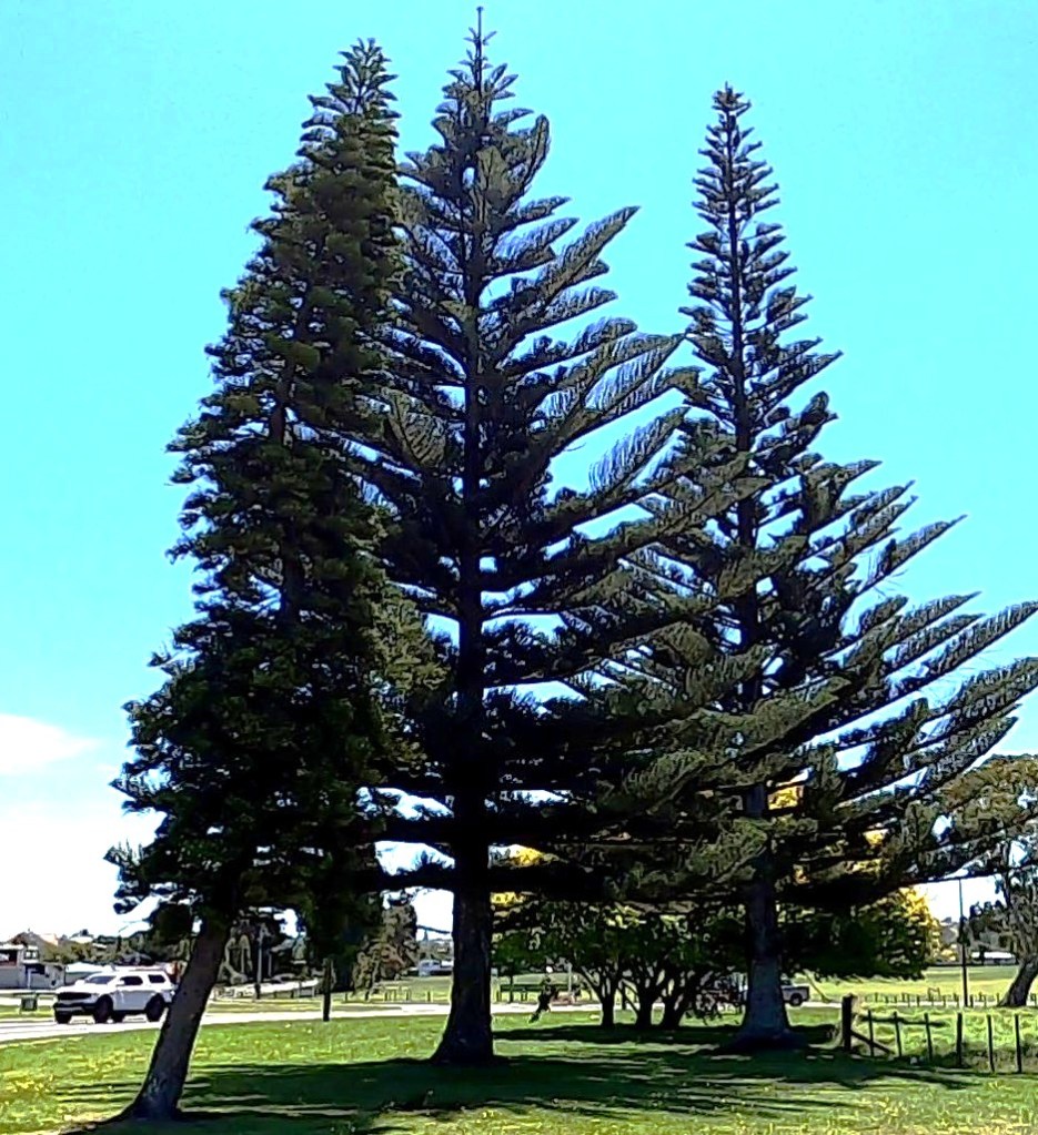 ‘Araucarian’ sounds like some kind of alien, but actually it is a term used for members of the Araucaria family. We’ve met a few representatives in previous posts: Norfolk Island pines (A. heterophylla), which are very common in New Zealand, particularly in the North Island; the Monkey Puzzle tree (A. araucana) from Chile and Argentina, which went through a worldwide phase of plant-celebrity status; and the odd mention of Kauri (Agathis australis), New Zealand’s sole endemic araucarian. In this post we’ll get to know Araucaria columnaris, commonly called the New Caledonia pine or Cook pine, which has the fascinating feature of being the ‘leaning araucarian’.