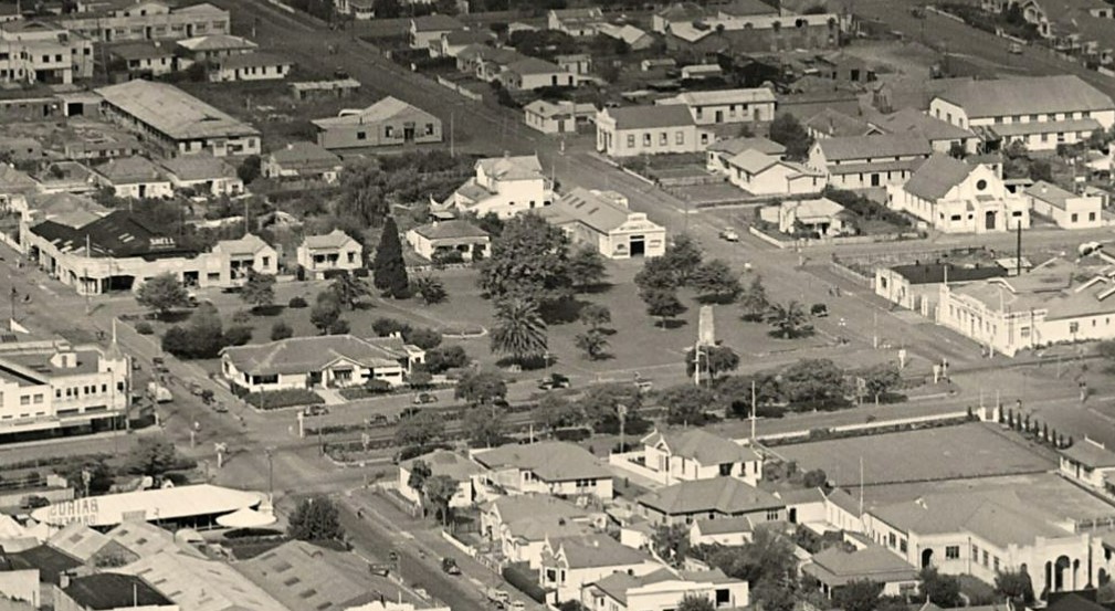 The cenotaph was unveiled on 11th November, 1923, and the size of the Phoenix palm visible here suggests it was planted not long after the unveiling. There were other Phoenix palms planted around Hawke’s Bay at this time, so it is not unexpected to see it here. Given its size in 1936 we can reasonably date its planting as about 1926 to 1928. Next consider an aerial photo from 1951:
