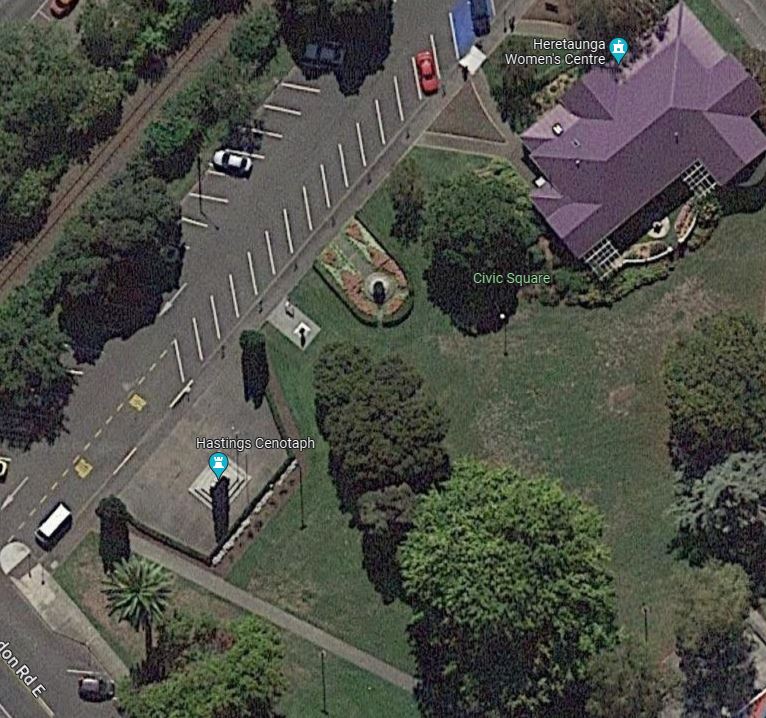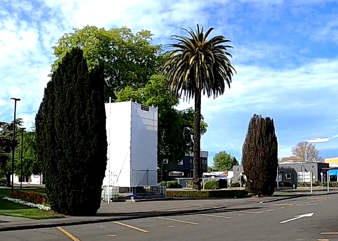 The cenotaph is clad in plastic wrap while it undergoes cleaning, but there behind it is the remaining Phoenix palm, probably about 86 years old at the time of the photograph. The two palms at the other side of Civic Square were removed when new developments occurred: the existing road was turned into part of the park where a new Hastings Art Gallery and Library were built. So, just like the full removals we saw in Part 2 of this blog series, development was again a reason for removal.