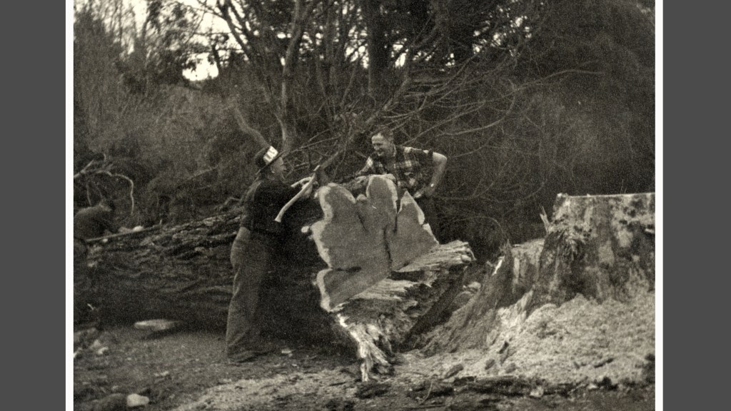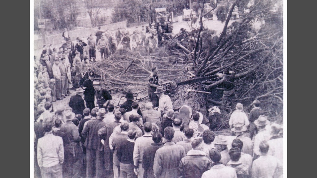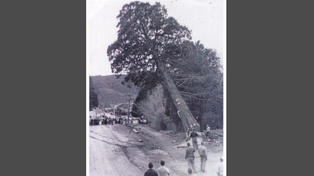 By the 1950s the local council wished Pine Avenue to be a major entry road into the central shopping area of Upper Hutt. At that time the road did not have an established footpath, and the need to develop such was the main justification for the removal of the first redwood (seen in the first photo above). Local residents banded together to resist this planned removal, with over a thousand signing a petition to save the tree. Nevertheless, the council was resolute in its plan: the tree was described as being 80 foot high and 6 feet thick, being only 3 feet from the road boundary, thus it had to go. Suggestions to put a deviating footpath around the tree were rejected and even an appeal by the then Governor General, Lord Norrie, and the Prime Minister, S. G. Holland, were not enough to force the council to change its mind. Holland rang Mr Slacke, the mayor, to plead for the tree’s retention, but ‘the mayor refused to give the matter any more consideration’.4 On 20 July 1957, in the presence of descendants of George Brown who had planted the redwoods, and with a large crowd gathered, Mr A. Clouston, manager of Akatarawa Sawmilling Company, directed the felling of the redwood. A few of the many photos taken of the event show just what a spectacle it was: