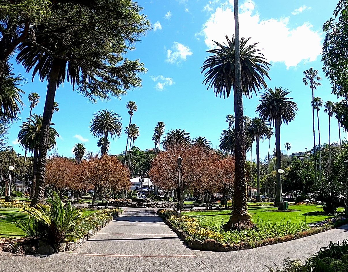 About 20 kilometres away in Napier, we can find more specimens of skydusters, this time planted in Napier’s premier central city park: Clive Square/Memorial Square. Luckily there is drone footage from a YouTube video that gives a good idea of the scale of the palms in the park: