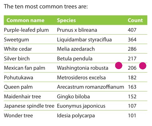 In part 1 of this post we saw significant plantings of W. robusta in Napier, but it is perhaps further north in Gisborne where there has been the largest mass planting of the palm in New Zealand. The numbers planted are recorded in this extract from a Gisborne District Council document:
