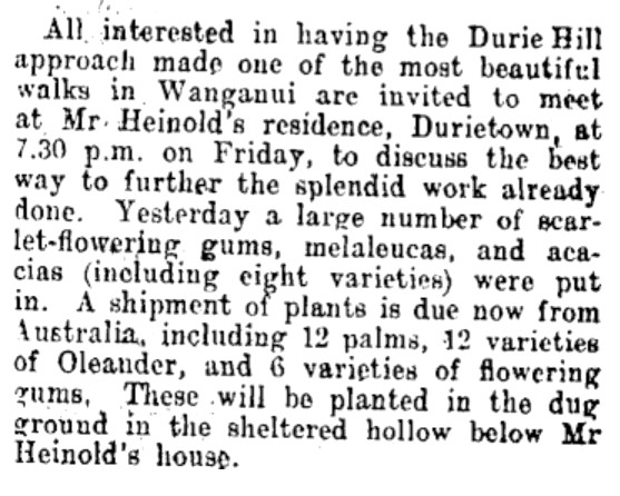 - Conrad Heinold (sometimes mistakenly spelt as Heinhold) was a naturalised German immigrant, who ran a successful butchers shop in central Wanganui. Not long after his involvement in the Durie Hill beautification, he fell victim to anti-German sentiment during World War One: his butcher’s shop was vandalised in a mini-riot, prompting Mr Massey, the Prime Minister, to issue a statement condemning the riot (see ‘Feeling against Germany: Big disturbance in Wanganui’, Otago Daily Times, 24 May, 1915, p. 3). ↩︎