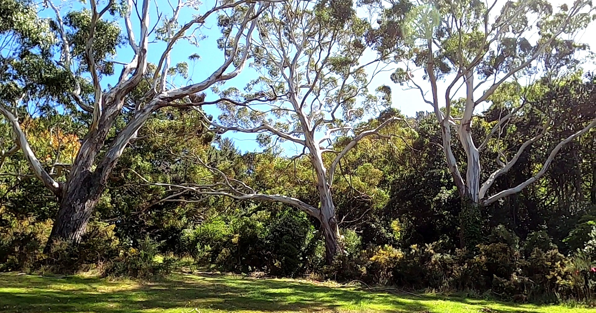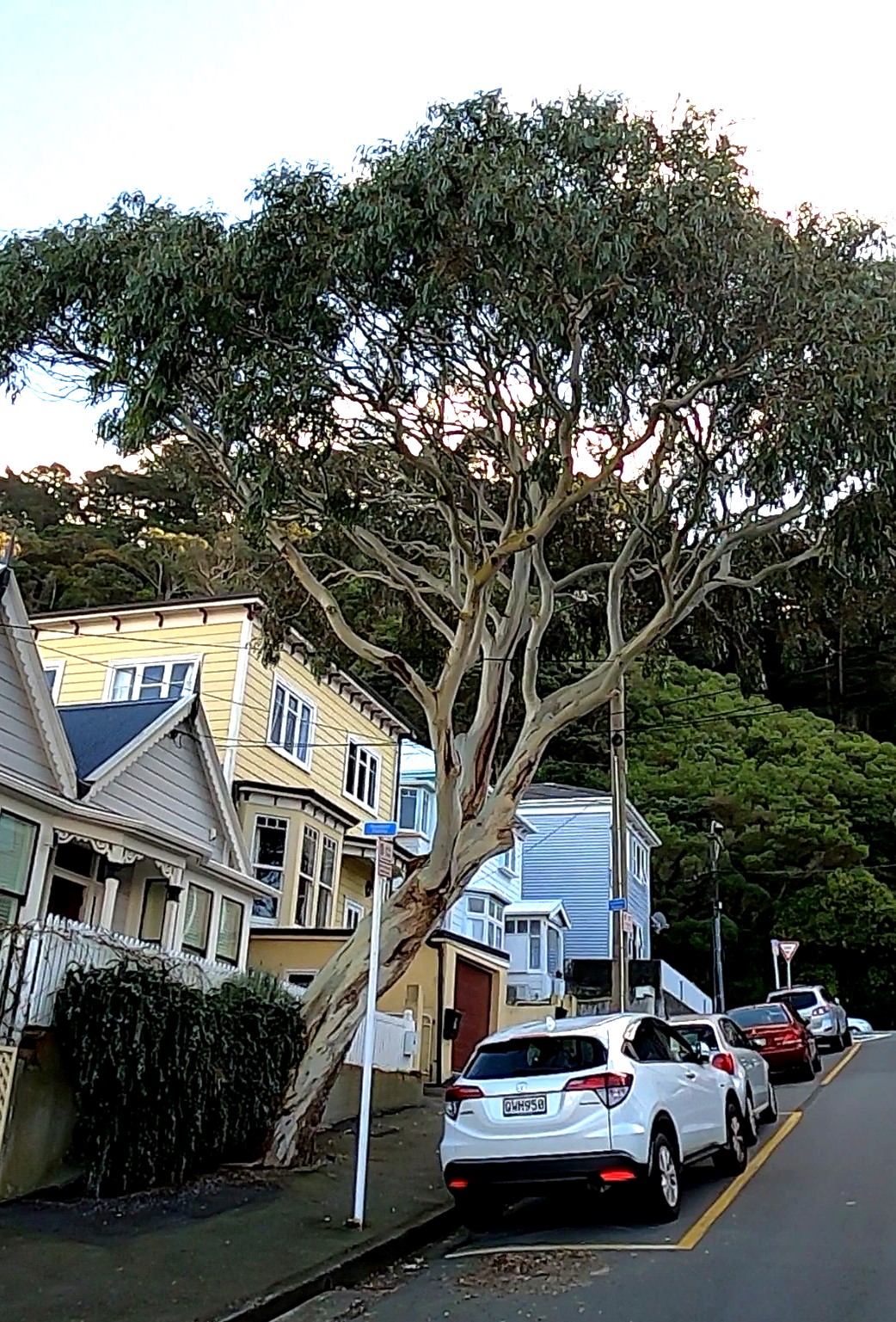 If you fly into Wellington and drive into town from the airport, the first significant trees you come across are in the Mt Victoria town belt. The planting of conifers in this large public reserve began in the early 1880s, and radiata pines and macrocarpa still predominate. Some of these old conifers featured in the Lord of the Rings film scenes known as ‘The way of the Nazgul’, ‘the Black Rider’, and ‘Hobbit hideaway’, and exact locations can be found on Google Maps. The large pines and macrocarpas do make a very good film set, but their darkness also makes an excellent contrast to a tree which is also common in New Zealand, but which as far as I know did not become part of the Lord of the Rings film sets. This is the tree commonly called the White Peppermint Gum, or in botanical nomenclature, Eucalyptus pulchella, which is a gum tree endemic to Tasmania, Australia. Some photos taken on a sunny day on the eastern side of the Mt Victoria town belt clearly show the aptness of the white descriptor: